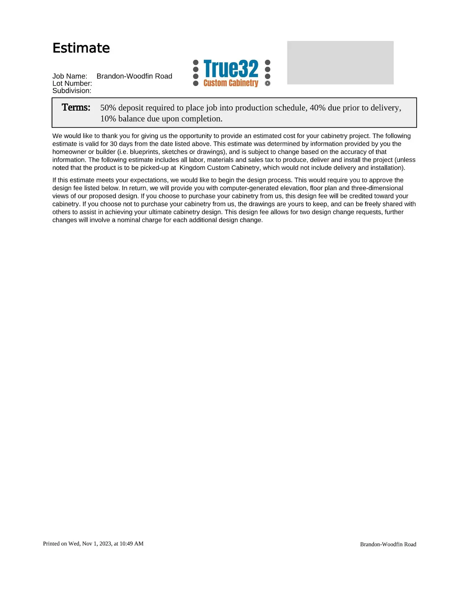 By the way, you signing our estimate is not a contract authorizing us to manufacture your cabinetry; you are only agreeing to pay us to field measure and design your project. Once we have produced the shop drawings and ultimately a proposal, if you choose to purchase your cabinetry from us the design fee/retainer will be part of the proposed price. If you choose to purchase your cabinetry elsewhere, then you are free to take the drawings/design, which you paid for, and shop them with as many cabinetmakers as you please.